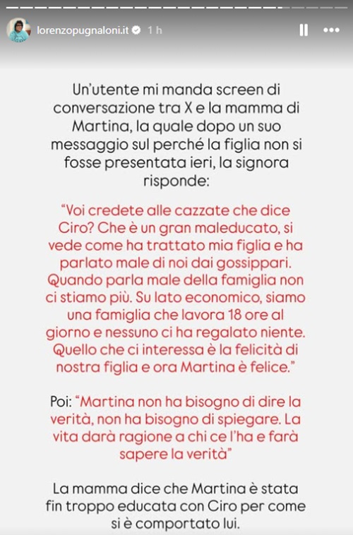 Ma non solo: sono emerse anche presunte dichiarazioni della madre di Martina, riportate da Lorenzo Pugnaloni tramite una fonte anonima. Secondo queste parole, la famiglia non avrebbe apprezzato i comportamenti di Ciro Solimeno, soprattutto per il modo in cui avrebbe parlato della loro famiglia: “Voi credete alle ca****te che dice Ciro? Che è un gran maleducato, si vede come ha trattato mia figlia e ha parlato male di noi dai gossippari”.