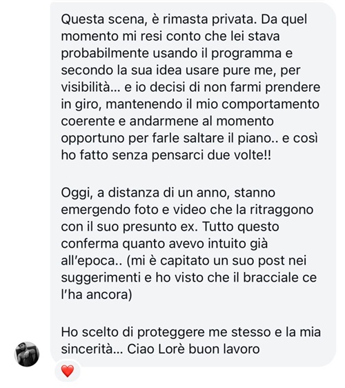 Secondo l’ex corteggiatore, questa scelta fu dettata dal bisogno di proteggere la propria sincerità, intuendo che l’interesse di Francesca fosse altrove.