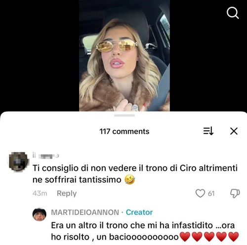 Recentemente, un utente su TikTok le ha suggerito di evitare di guardare l’ex compagno in tv per non soffrire. Martina De Ioannon ha risposto senza esitazione: “Era un altro il trono che mi dava fastidio. Adesso ho risolto”.