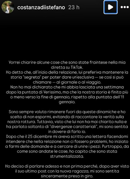 Con un post pubblicato su Instagram, la ragazza ha accusato il nuotatore di averla strumentalizzata, e ha chiarito alcune imprecisioni emerse durante una recente live su TikTok. Costanza ha descritto Manuel come una persona volubile, capace di allontanarsi nonostante si fosse dichiarato innamorato fino a pochissimo tempo prima della fine della storia.