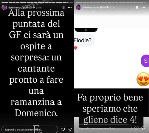 Secondo quanto rivelato da Deianira Marzano, nella semifinale ci sarà un ospite d’eccezione: Elodie, che entrerà nella Casa per una presunta “ramanzina” a Domenico D’Alterio. Un momento che promette scintille, considerando le recenti polemiche legate al concorrente.