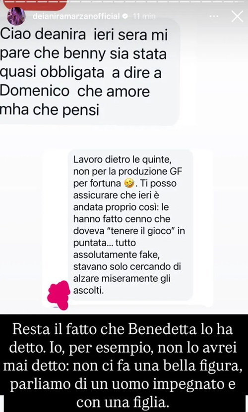 Non tutti hanno creduto alla spontaneità della dichiarazione. Una fonte dietro le quinte ha confermato a Deianira Marzano: “Lavoro dietro le quinte, non per la produzione GF per fortuna. Ti posso assicurare che ieri è andata proprio così: le hanno fatto cenno che doveva ‘tenere il gioco’ in puntata… tutto assolutamente fake, stavano solo cercando di alzare miseramente gli ascolti”.