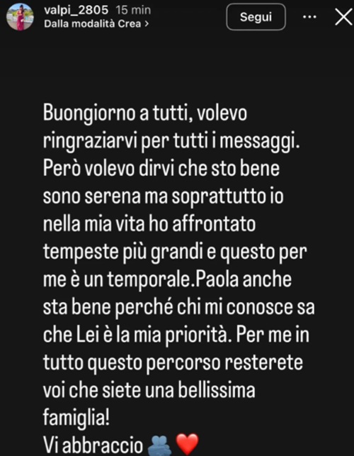 Intanto, sui social, Valentina Piscopo ha condiviso il suo stato d’animo: “Buongiorno a tutti, volevo ringraziarvi per tutti i messaggi. Però volevo dirvi che sto bene, sono serena, ma soprattutto io nella mia vita ho affrontato tempeste più grandi e questo per me è un temporale. Paola anche sta bene perché chi mi conosce sa che lei è la mia priorità. Per me in tutto questo percorso resterete voi che siete una bellissima famiglia! Vi abbraccio”.