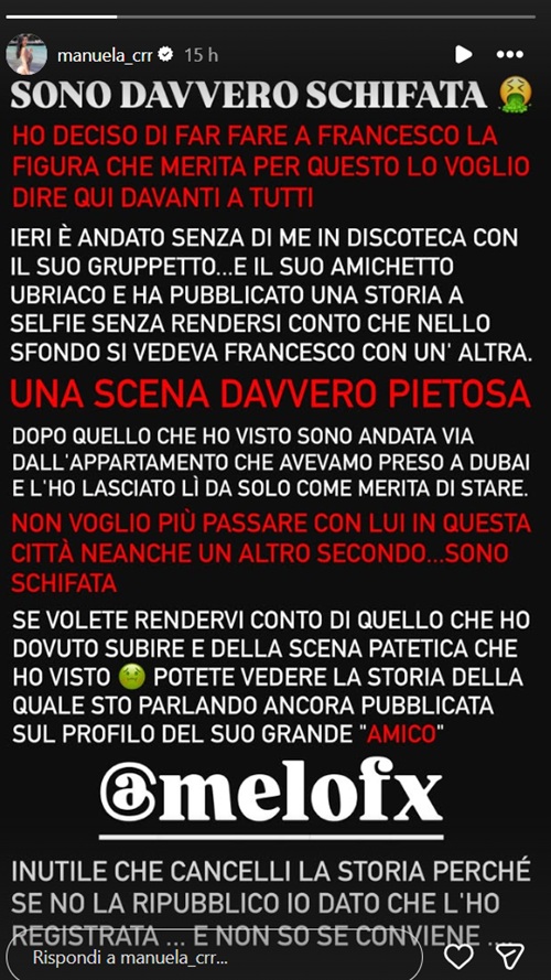Nel suo sfogo, Manuela Carriero si è rivolta anche all’amico di Francesco Chiofalo che ha pubblicato la storia incriminata, lanciando un chiaro avvertimento: “E’ inutile che cancelli la storia perché se no la ripubblico io. L’ho registrata… e non so se conviene”.