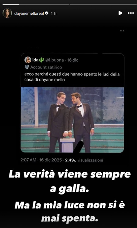 Successivamente, Dayane Mello ha pubblicato un lungo messaggio, riportando le sue emozioni e riflessioni: “Non sempre essere veri è sufficiente. Non sempre dare il massimo, donarsi completamente, agire con il cuore pulito... garantisce un risultato giusto. L’ho imparato sulla mia pelle. Ci sono momenti in cui fai tutto nel modo giusto, cammini con onestà, rispetti, credi, ti fidi. Eppure, ci saranno sempre persone pronte a passarti sopra - non per la tua debolezza, ma proprio per la tua luce. E questo fa male. Fa profondamente male. Ho vissuto un’ingiustizia che molti hanno visto, e che forse altri non riusciranno mai a comprendere fino in fondo. Al Grande Fratello, ho vissuto ogni istante intensamente, sono stata me stessa, senza maschere. E nonostante questo, non ho portato a casa il premio. Non perché mi sia mancata la verità, ma perché a volte la verità non vince subito. Ed è giusto riconoscere il dolore.