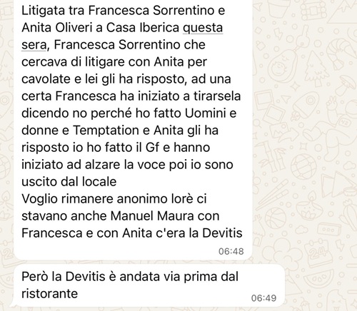 Secondo la segnalazione, il punto di rottura sarebbe arrivato quando Francesca avrebbe sottolineato ad alta voce il proprio percorso televisivo, dichiarando: “Io ho fatto Uomini e Donne e Temptation Island…”.