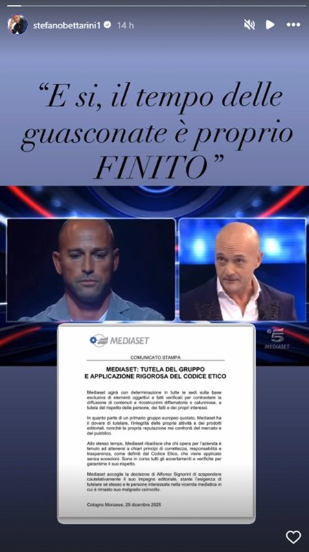 Stefano Bettarini non ha nascosto la sua soddisfazione per la decisione di Alfonso Signorini di autosospendersi da Mediaset, comunicata il 29 dicembre tramite i suoi legali. L’ex concorrente del Grande Fratello Vip ha condiviso sui social sia il comunicato ufficiale dei vertici di Cologno Monzese sia un vecchio filmato che lo vedeva protagonista insieme al conduttore.