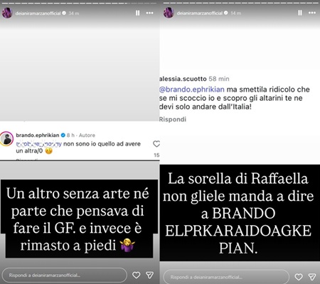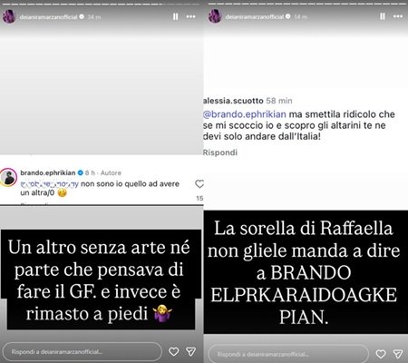 La risposta di Brando non è passata inosservata e ha provocato l’intervento della sorella di Raffaella, Alessia Scuotto, che ha commentato: “Smettila, ridicolo! Se mi scoccio e scopro tutti gli altarini te ne devi andare dall’Italia”.