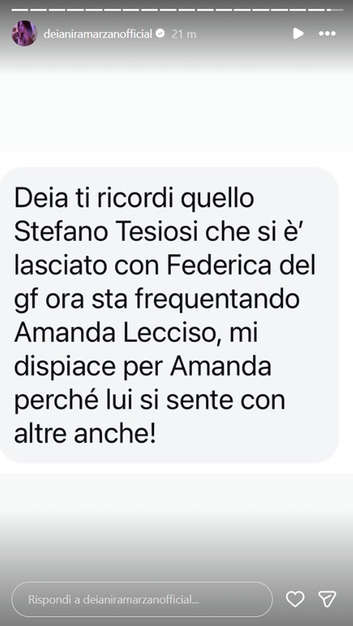 Avrebbe del clamoroso – se confermata – il gossip arrivato nelle ultime ore a Deianira Marzano. Secondo le segnalazioni riportate dalla nota esperta di cronaca rosa, Stefano Tediosi, reduce dalla recente rottura con Federica Petagna, avrebbe iniziato una frequentazione con un’altra ex concorrente del Grande Fratello: Amanda Lecciso.