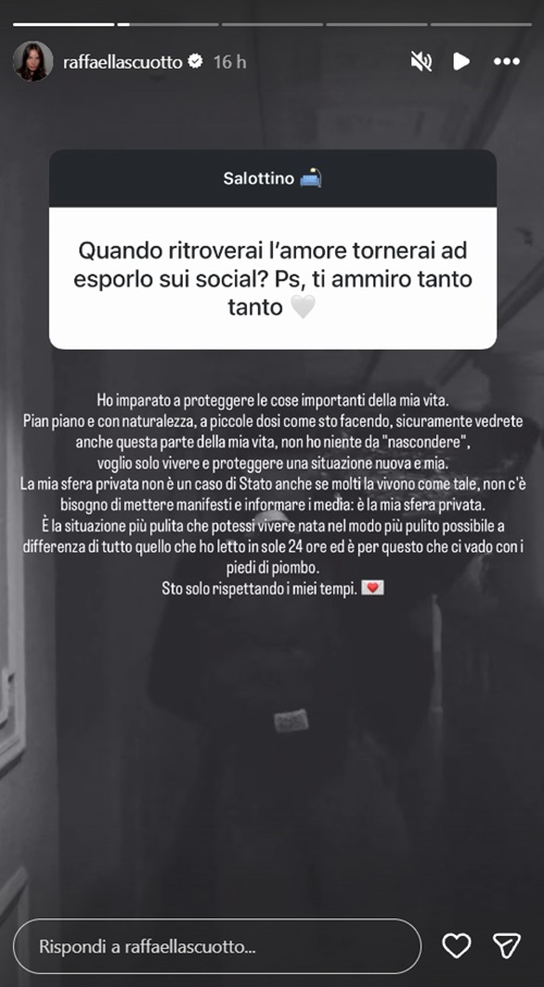Nelle scorse ore Raffaella Scuotto, incalzata dalle domande dei follower, ha deciso di chiarire pubblicamente il motivo per cui non ha ancora mostrato il suo presunto nuovo fidanzato sui social. Attraverso una storia pubblicata su Instagram, l’ex corteggiatrice ha spiegato la sua posizione con parole molto chiare: “Ho imparato a proteggere le cose importanti della mia vita. Pian piano, con naturalezza, a piccole dosi come sto facendo, sicuramente vedrete anche questa parte della mia vita. Non ho niente da nascondere. Voglio solo vivere e proteggere una situazione nuova e mia. La mia sfera privata non è un caso di Stato, anche se molti la vivono come tale. Non c’è bisogno di mettere i manifesti e informare i media. È la mia sfera privata”.