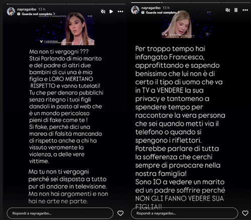 Le dichiarazioni di Clizia Incorvaia hanno scatenato la dura risposta di Nayra Garibo, moglie di Francesco Sarcina, che ha accusato la influencer di dire falsità per visibilità televisiva: “Ma non ti vergogni? Stai parlando di mio marito e del padre di altri due bambini, di cui una è mia figlia, e loro meritano rispetto e vanno tutelati. Tu che per denaro pubblichi senza ritegno i tuoi figli, dandoli in pasto al web, un mondo pericoloso pieno di fake come te! Si fake, perché dici una marea di falsità, mancando di rispetto anche a chi ha vissuto veramente la violenza, a delle vere vittime. Ma tu non ti vergogni perché sei disposta a tutto pur di andare in televisione. Ma non hai argomenti e non hai né arte né parte. Per troppo tempo hai infangato Francesco, approfittando e sapendo benissimo che lui non è di certo il tipo di uomo che va in tv a vendere la sua privacy…