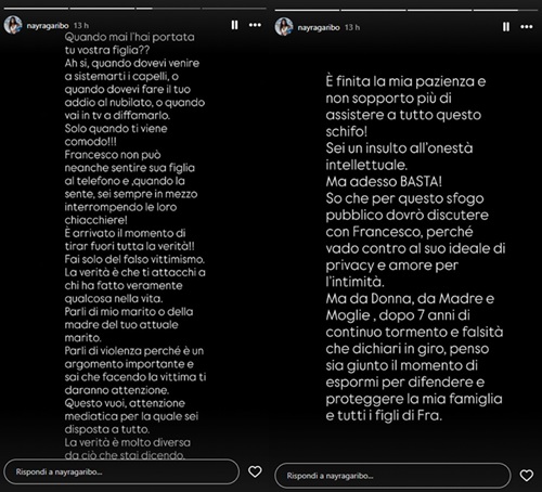 È arrivato il momento di tirar fuori la verità! Fai solo del falso vittimismo. La verità è che ti attacchi a chi ha fatto veramente qualcosa nella vita. E’ finita la mia pazienza e non sopporto più assistere a questo schifo! Sei un insulto all’onestà intellettuale. Ma adesso basta! So che per questo sfogo pubblico dovrò discutere con Francesco, perché vado contro il suo ideale di privacy e amore per l’intimità. Ma da donna, da madre, da moglie, dopo sette anni di continuo tormento e falsità che dichiari in giro, penso sia giunto il momento di espormi per difendere e proteggere la mia famiglia e tutti i figli di Francesco”.