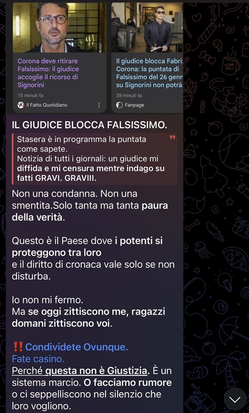 Il commento di Fabrizio Corona su Telegram