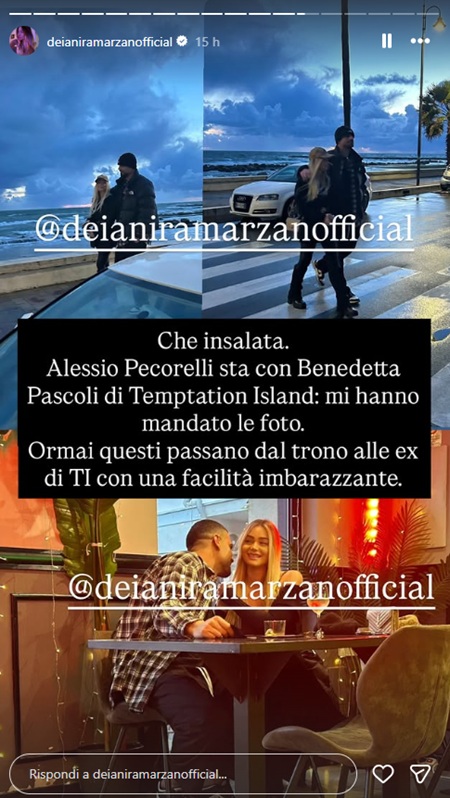 Nelle scorse ore, Alessio è stato paparazzato in teneri atteggiamenti con Benedetta Pascali, ex tentatrice di Temptation Island. Benedetta aveva partecipato al programma intrattenendo una frequentazione con Daniele De Bosis, proseguita per qualche tempo anche al di fuori dello show.