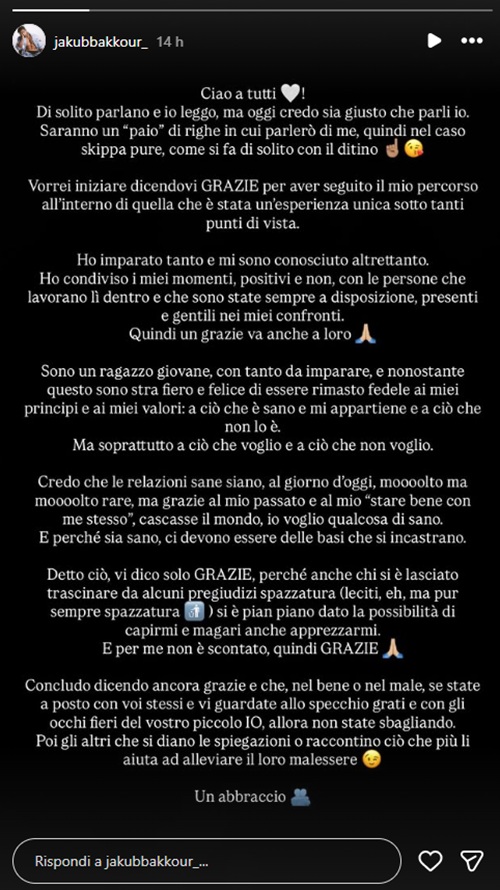 Dopo la messa in onda della puntata, Jakub Bakkour ha pubblicato un lungo messaggio su Instagram in cui spiega le motivazioni della sua scelta: “Sono felice e fiero di essere rimasto fedele ai miei principi, ai miei valori e a ciò che voglio e non voglio più. Credo che le relazioni sane siano molto rare oggi, ma grazie al mio passato e al mio ‘stare bene con me stesso’, voglio qualcosa di sano. E perché sia sano, ci devono essere delle basi che si incastrano”.