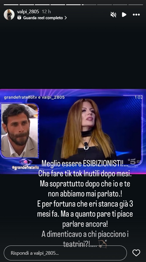 Le sue parole sono apparse come una chiara frecciatina all’ex gieffina: “Meglio essere esibizionisti che fare TikTok inutili dopo mesi. Ma soprattutto dopo che io e te non abbiamo mai parlato. E per fortuna che eri stanca già tre mesi fa. Ma a quanto pare ti piace parlare ancora! Ah, dimenticavo, a chi piacciono i teatrini?”.