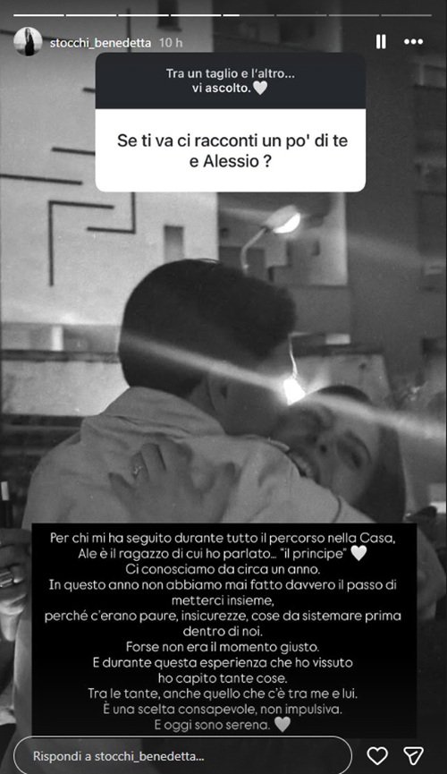 A confermare tutto è stata la stessa ex gieffina rispondendo alle domande dei fan: “Per chi mi ha seguito durante tutto il percorso nella Casa, Ale è il ragazzo di cui ho parlato… ‘il principe’. Ci conosciamo da circa un anno, ma non abbiamo mai fatto davvero il passo di metterci insieme, perché c’erano paure, insicurezze, cose da sistemare prima dentro di noi. Forse non era il momento giusto. E durante questa esperienza ho capito tante cose. Tra le tante, anche quello che c’è tra me e lui. È una scelta consapevole, non impulsiva. E oggi sono serena”.