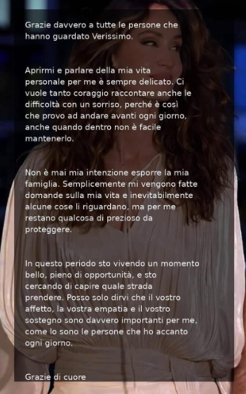 Uno dei passaggi più toccanti del messaggio riguarda la famiglia, tema che durante l’intervista a Verissimo ha inevitabilmente toccato corde profonde.