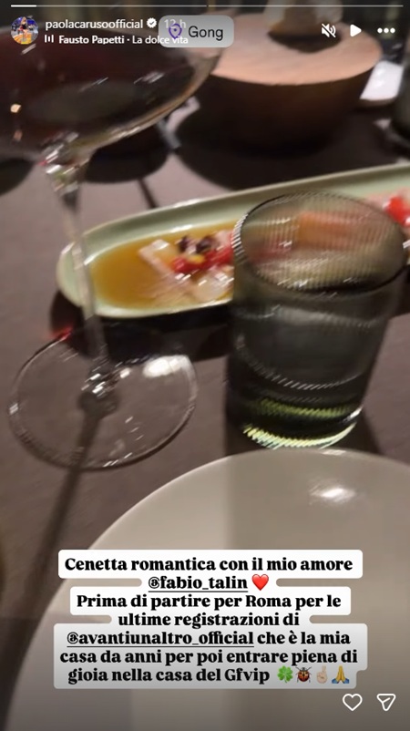 La replica di Paola Caruso non si è fatta attendere. Su Instagram, la showgirl ha pubblicato una storia mostrando una cenetta romantica con il compagno Fabio Talin e aggiornando i fan sui suoi prossimi impegni lavorativi. Ha confermato di essere diretta a Roma per le registrazioni di Avanti un altro, e ha dichiarato di entrare nella casa del Grande Fratello Vip “piena di gioia”.