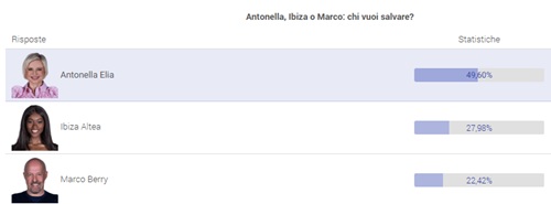 A giocarsi la permanenza nel reality sono Ibiza Altea, già reduce dalla sconfitta al televoto contro Raimondo Todaro, insieme a Antonella Elia e Marco Berry. Tre nomi molto diversi tra loro, che riflettono dinamiche e consensi altrettanto differenti.