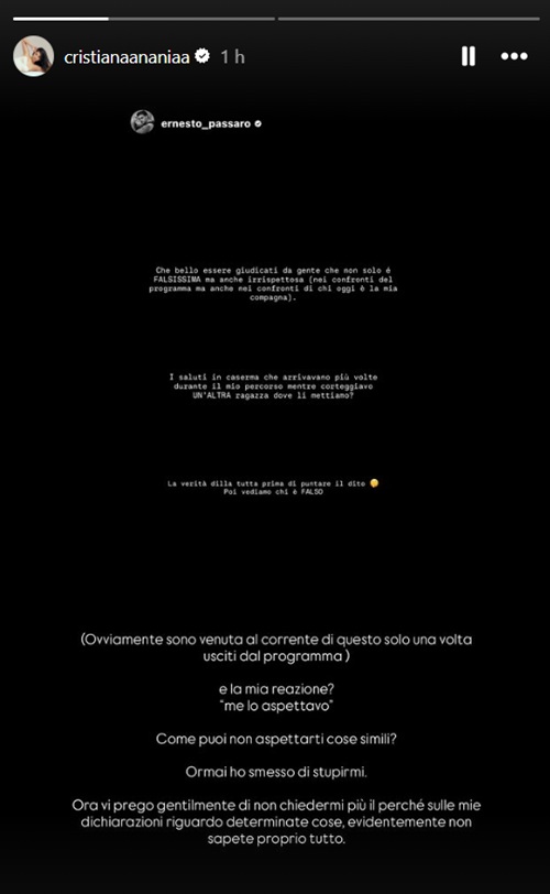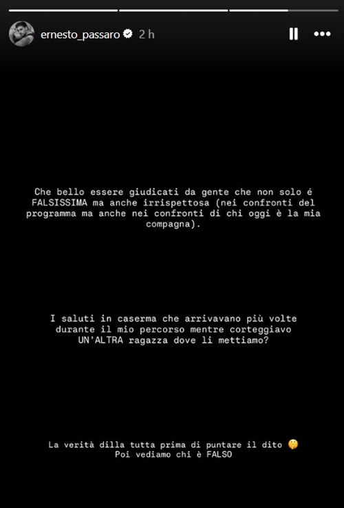 Attraverso alcune storie Instagram, Ernesto Passaro ha condiviso un messaggio molto duro, poi rilanciato anche da Cristiana Anania. Parole che sembrano rivolte direttamente a Sara Gaudenzi e che hanno immediatamente attirato l’attenzione dei fan del programma.
