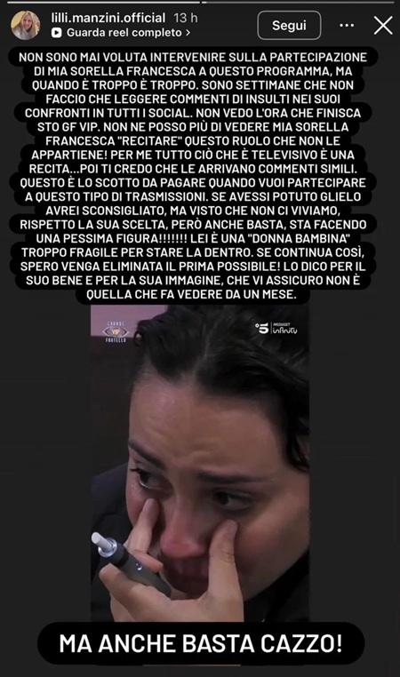 La donna ha dichiarato di essere stanca dei continui insulti sui social e ha espresso forte preoccupazione per l’immagine della sorella: “Non vedo l’ora che finisca sto GF Vip. Non ne posso più di vedere mia sorella Francesca recitare questo ruolo che non le appartiene. Lei è una donna bambina, troppo fragile per stare là dentro. Se continua così spero venga eliminata il prima possibile”.
