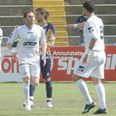 Gioco a viso aperto, gara pirotecnica. Savoia e Grottaglie danno vita ad un vero e proprio spettacolo nellanticipo del Giraud, regalando novanta minuti di gol e bel gioco al pubblico torrese. Con un piede e mezzo dei playoff, il tecnico pugliese deve far fronte allimprovviso forfait di Pastano ed è costretto a mandare in panchina Di Donna. Pochi problemi invece per Vesce, che rinuncia soltanto allo squalificato Esposito. Match vivace e gradevole fin dalle prime battute. Al 2 Incoronato fa centro sul traversone dalla sinistra di Semplice, ma la rete viene annullata per una spinta del centravanti oplontino a Camassa. Passano solo cento secondi ed è invece il Grottaglie a portarsi in vantaggio. Sugli sviluppi di un calcio di punizione battuto da Marchi, Pirone supera Masullo con un pallonetto. La sfera rimane ad un passo dalla linea di porta e la raccoglie Lacarra siglando il vantaggio per gli ospiti. La rete del Grottaglie scuote i padroni di casa, che trovano il pareggio al 12: calcio dangolo di De Rosa, stacco perentorio di Incoronato e palla in rete. Quattordicesima marcatura per il centravanti biancoscudato, che si conferma come cannoniere principe del Savoia. Col passare dei minuti sono gli oplontini ad imporre il proprio gioco e ad andare vicini al vantaggio. Al 19 una percussione centrale di De Rosa mette in seria difficoltà la retroguardia pugliese, ma il diagonale dellesterno attraversa tutto lo specchio della porta e termina a lato. Nove minuti più tardi è lo stesso De Rosa a propiziare il vantaggio del Savoia: il calciatore torrese recupera palla e costringe DAmario al fallo al limite dellarea. Il calcio di punizione viene battuto dallo stesso De Rosa (nella foto), che di destro sorprende Laghezza sul suo palo e ribalta il risultato. Al 33 è di nuovo De Rosa ad avere la palla del 3-1: il suo tiro al volo dalla trequarti di campo, su assist di Chisena, viene bloccato da Laghezza. Il bianchi cercano con insistenza il terzo gol: stavolta è Incoronato, al 45, a mancare il bersaglio con un colpo di testa su cross di De Rosa. Loccasione più ghiotta della prima frazione è però del Grottaglie: al 47 una punizione potentissima di Marchi costringe Masullo alla respinta con i pugni. DAmblè raccoglie la sfera, ma la sua conclusione a colpo sicuro si stampa sul palo alla sinistra del portiere torrese. Il ritmo di gioco rimane alto anche nel secondo tempo, con unoccasione per il Savoia al secondo minuto: solito scambio sullasse De Rosa-Incoronato, chiuso dal colpo di testa del cannoniere torrese che manca di poco lo specchio della porta. Risponde il Grottaglie al 12 ancora con una sassata di Marchi su calcio di punizione respinta di pugno da Masullo. Due minuti dopo è DAmblè ad avere su piedi la palla del pareggio. Provvidenziale il doppio intervento di Masullo, che respinge la prima conclusione e blocca il tentativo di rovesciata dello stesso DAmblè. Con un Savoia in difficoltà, Vesce corre ai ripari inserendo Abate e Chiaiese per Venditto e De Rosa. Proprio Chiaiese, al 25, sigla la terza rete per i biancoscudati: scambio micidiale in contropiede tra lo stesso Chiaiese ed Incoronato, con il neo-entrato che, solo davanti a Laghezza, lo supera con un sinistro potente nellangolo basso. Il terzo gol però non annichilisce gli ospiti, che accorciano dopo dieci minuti con unazione insistita: Chiesa serve DAmblè in area, che con un destro a giro batte Masullo sul secondo palo. È ancora il Grottaglie a farsi vivo al 38 con un colpo di testa di Favret, su angolo di Lops, bloccato da Masullo. Al 46 gli ospiti hanno lopportunità di pareggiare ma il tiro al volo di DAmblè, imbeccato da Favret, termina alto.