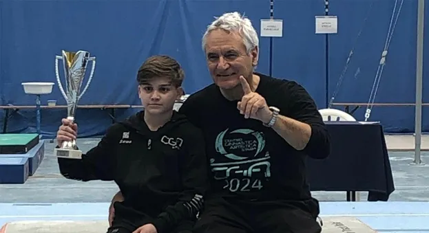 Le buone notizie arrivano da Mortara dove si sono disputati i Campionati Interregionali Gold maschili Centro-Sud Allievi. Gabriel Russo (nella foto), atleta del C.G.A. Stabia Castellammare di Stefania Gini, si è imposto nella categoria Allievi 4^ fascia vincendo la gara con quasi otto punti di vantaggio sul secondo classificato. Il talento stabiese, allenato a Castellammare da Angelo Radmilovic (nella foto), infatti, ha totalizzato punti 69.70 contro i 61.75 di Riccardo Chiappini dell’Eschilo Sporting Roma.