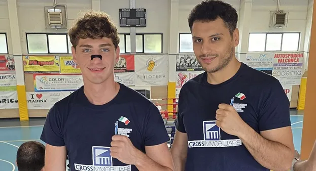 Davide, il fratello di Stefano de Martino, con il compagno di palestra Alessandro Casillo, in evidenza alla Coppa Italia Gym Boxe.