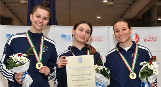 Un trionfo indimenticabile per Anna Marie Maisto (al centro nella foto), studentessa del Liceo Pitagora-Croce di Torre Annunziata, che insieme alle compagne di squadra del Club Scherma Salerno ha conquistato la medaglia d'oro ai Campionati Italiani a squadre di fioretto Serie B2, tenutisi al Piacenza Expo.