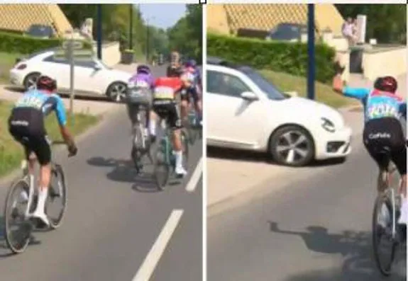 A documentare il tutto le telecamere di Eurosport, che mostrano come il conducente di un'automobile bianca, si sia 'affacciato' in strada scendendo a tutta velocità da una strada sterrata secondaria e si stesse per immettere nella corsia senza prima controllare che non arrivassero veicoli. Proprio in quel momento infatti, come mostra il video, stavano transitando i corridori che hanno rischiato di venire investiti o di cadere: il gruppetto ha dovuto effettuare un rapido cambio di direzione per evitare l'automobile. Solo uno spavento però, fortunatamente, per i corridori, con l'auto che ha frenato in tempo.