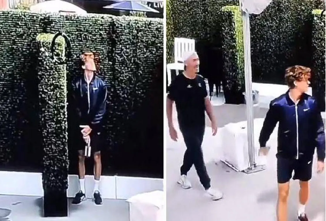 L'azzurro si apposta dietro una colonna in attesa probabilmente di saltar fuori al passaggio dell'allenatore australiano. Il piano del numero 1 del mondo, però, naufraga miseramente. Cahill si accorge del maldestro tentativo, niente blitz. Sinner rimandato come giocatore di nascondino.