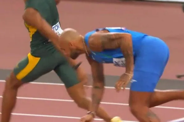 Tutto è successo al momento del primo passaggio di testimone. Jacobs, che partiva in seconda frazione, riceve il testimone da Andrea Desalu, scattato dai blocchi, ma al momento di cominciare a correre viene impattato da un velocista sudafricano, vicino di corsia, che lo sbilancia fino a farlo quasi cadere.